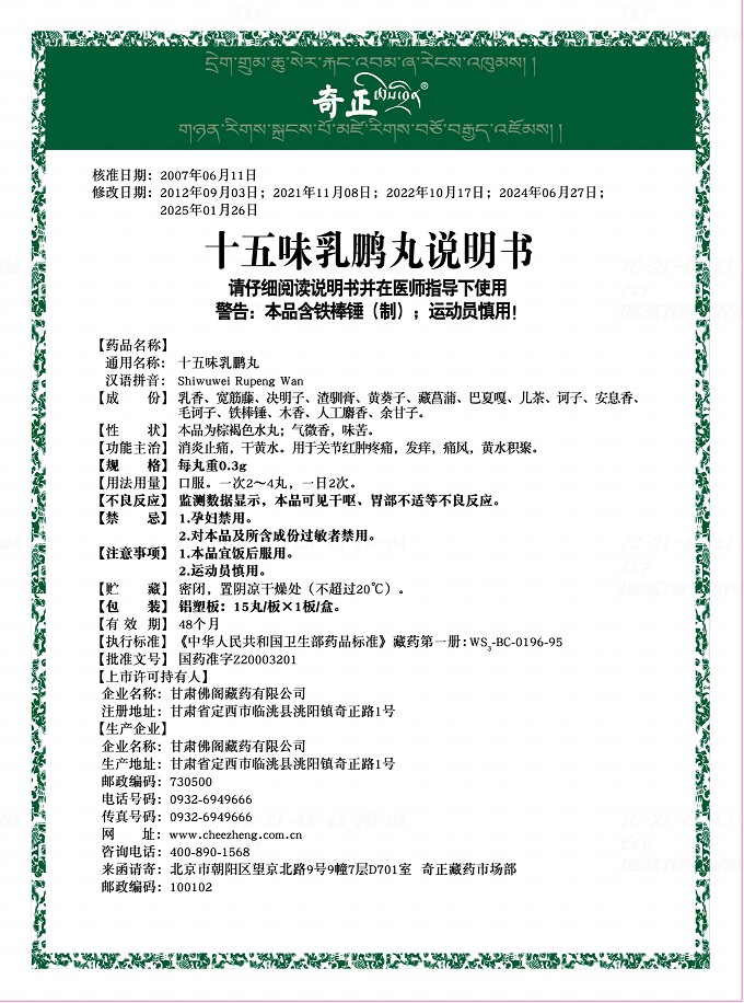甘肅佛閣藏藥有限公司按照十五味乳鵬丸獲批的國家藥品監(jiān)督管理局藥品補充申請通知書內(nèi)容,對十五味乳鵬丸藥品說明書中的警示語、【不良反應】、【禁忌】和【注意事項】進行了修訂及備案,現(xiàn)將新版說明書予以發(fā)布,如您需要更為詳細的信息或有特定的問題,可以聯(lián)系客服400-890-1568或撥打企業(yè)電話:0932-6949666。